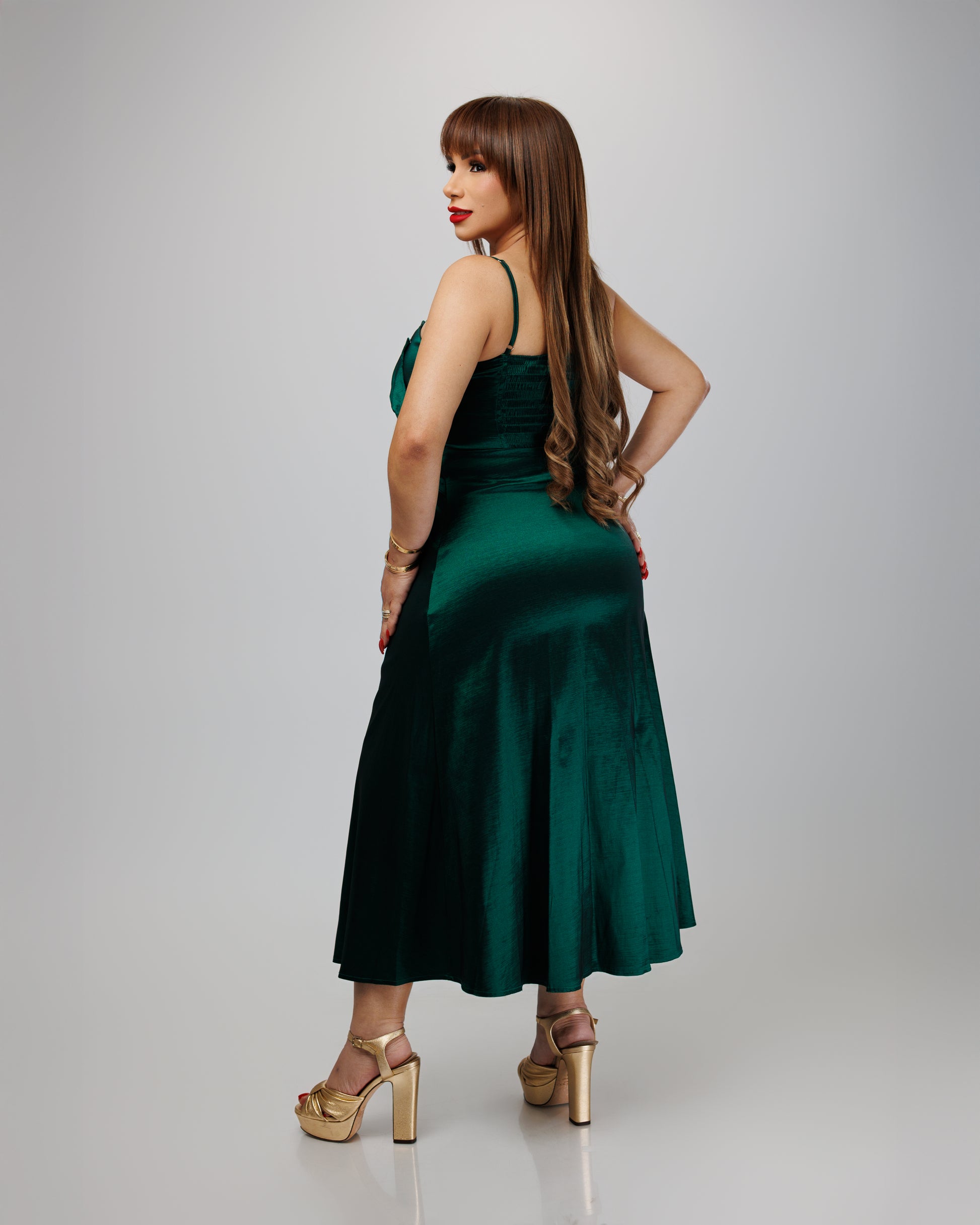 El vestido AMALIS combina elegancia y comodidad con su diseño sofisticado. Confeccionado en tafetán de acabado satinado, presenta un detalle de pliegues amplios y drapeados que se cruzan elegantemente en la parte superior, creando una silueta favorecedora y dinámica. El elástico estratégicamente colocado en la espalda proporciona ajuste perfecto, mientras que los manguillos ajustables te permiten personalizar el fit según tus preferencias. Una pieza versátil que transita sin esfuerzo de eventos especiales a ocasiones sofisticadas, garantizando que te sientas segura y radiante.