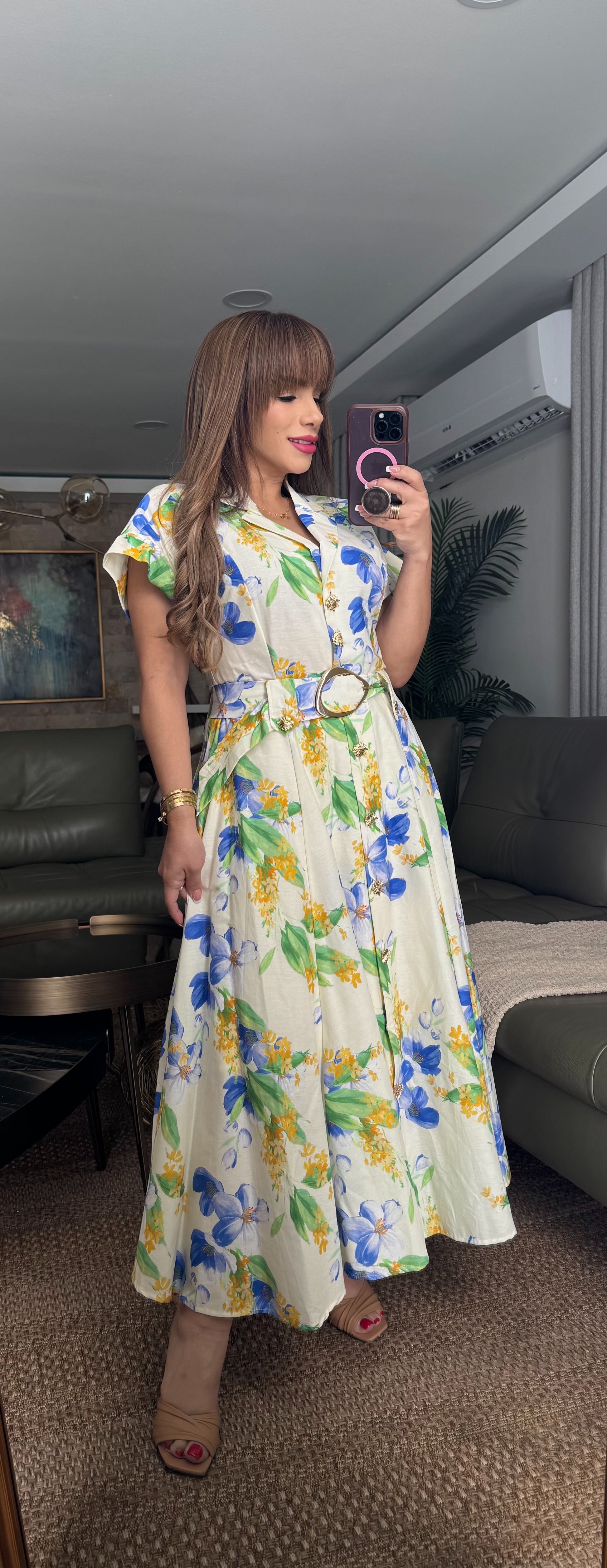 Descubre el encanto de nuestro vestido BRISEIDA MIDI, la pieza perfecta para lucir elegante y sofisticada. Este diseño cautivador presenta un hermoso estampado floral en tonos primaverales que te transportarán a un jardín en plena floración. El cuello en V favorecedor se complementa con botones dorados funcionales al frente, añadiendo un toque de lujo a cada movimiento. Incluye una correa con hebilla dorada que define tu silueta y eleva tu look al siguiente nivel. Con un corte midi versátil que corre al size, este vestido es tu aliado perfecto para cualquier ocasión especial. Siente la comodidad y el estilo en una sola prenda.