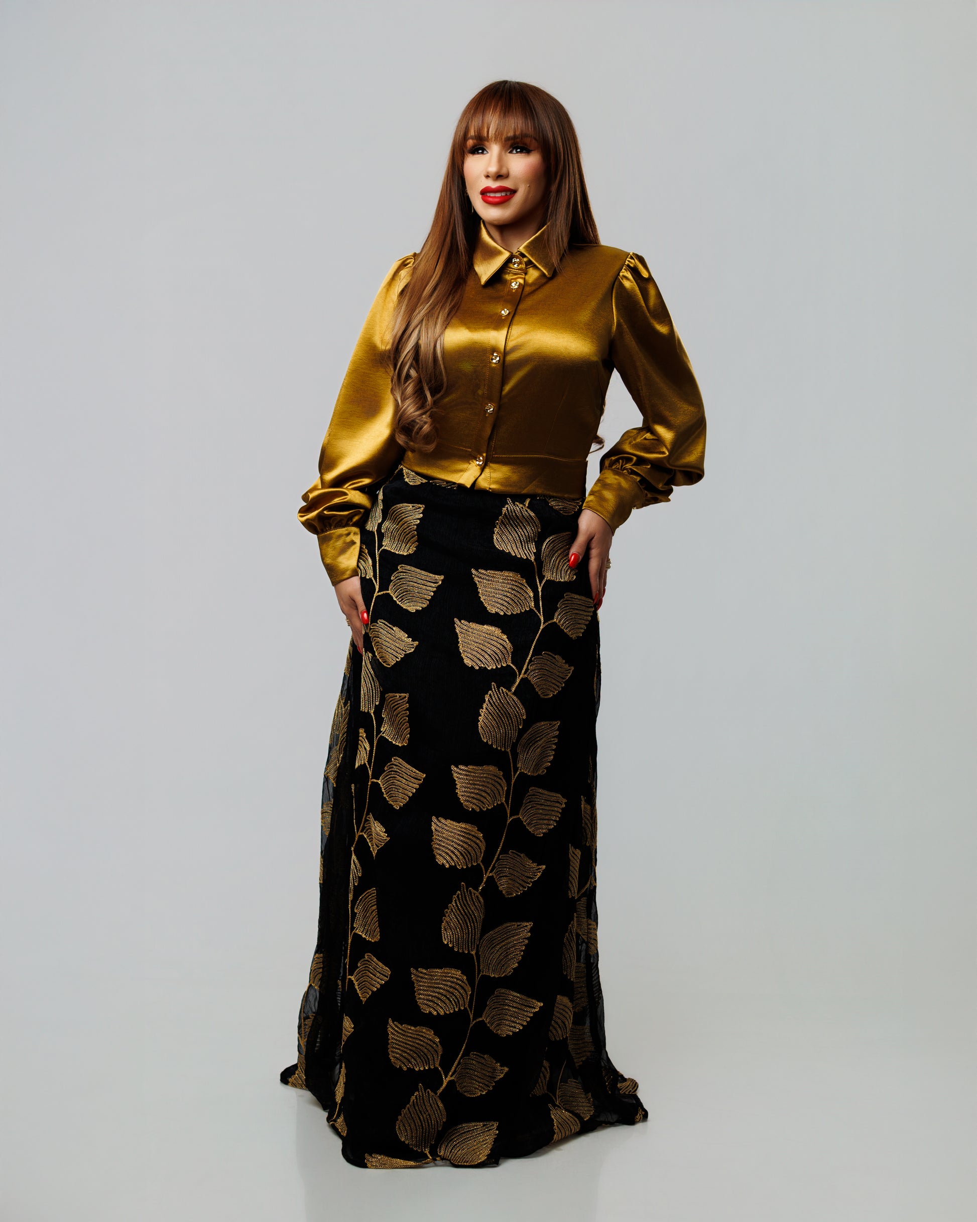The Felicity Set combines elegance and charm with a button-front blouse featuring stylish sleeves, perfectly paired with a skirt adorned in a sophisticated golden print. This coordinated outfit promises to elevate your look effortlessly, making it ideal for special occasions or making a statement wherever you go. Embrace grace and confidence in this beautifully designed set.