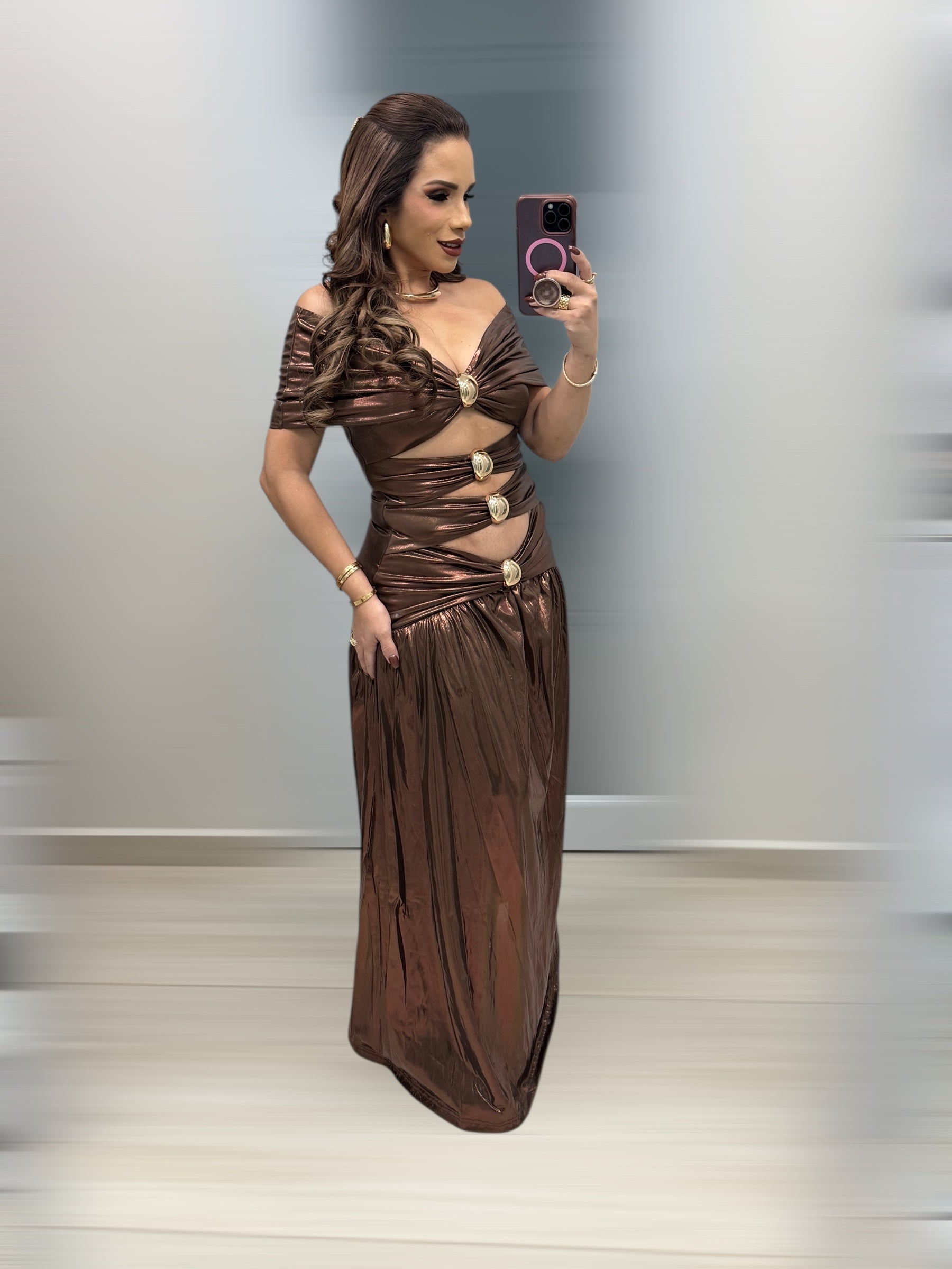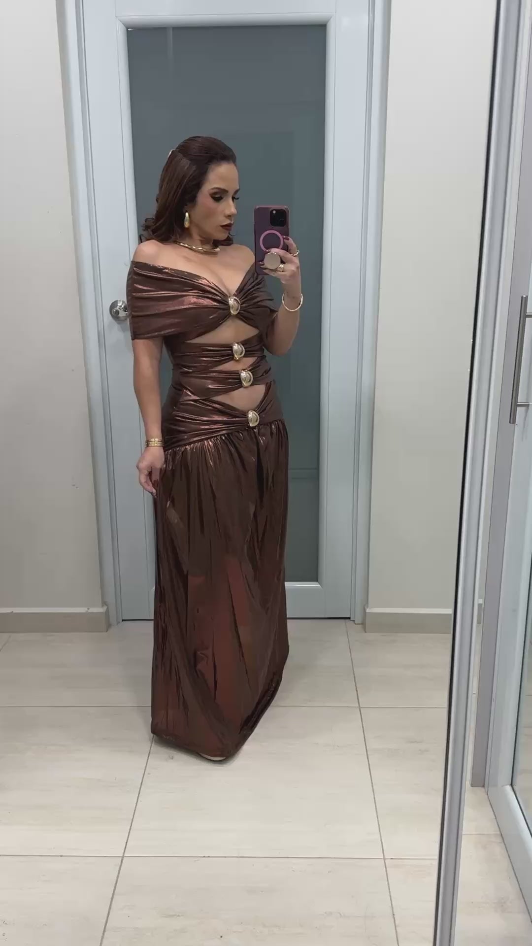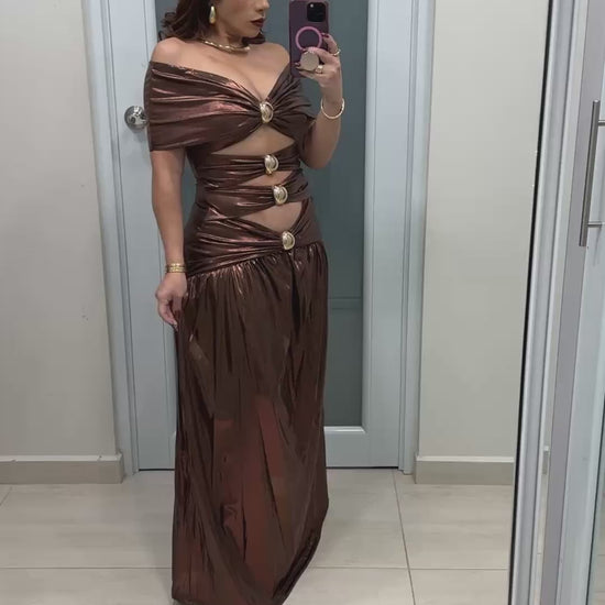 Este vestido Metallic Sunset cautiva con su tela metálica brillante y cut-outs estratégicos en abdomen y cintura, cada uno decorado con cuatro grandes botones que realzan su estilo audaz. El escote corazón acentúa la feminidad, mientras que la tela removible en los hombros ofrece versatilidad para diferentes estilos. Perfecto para quienes buscan un look sofisticado y llamativo que destaca en cualquier ocasión especial.