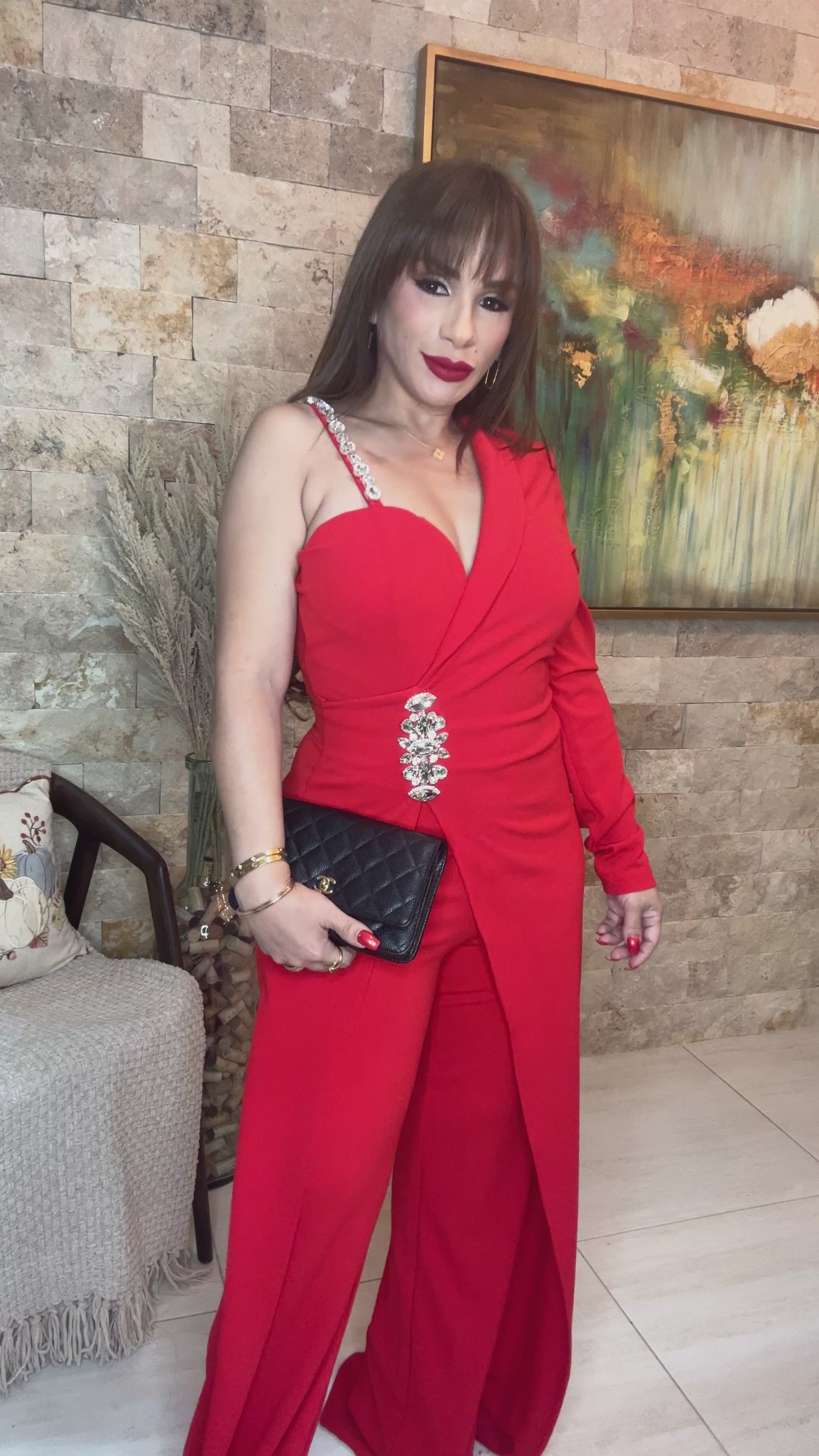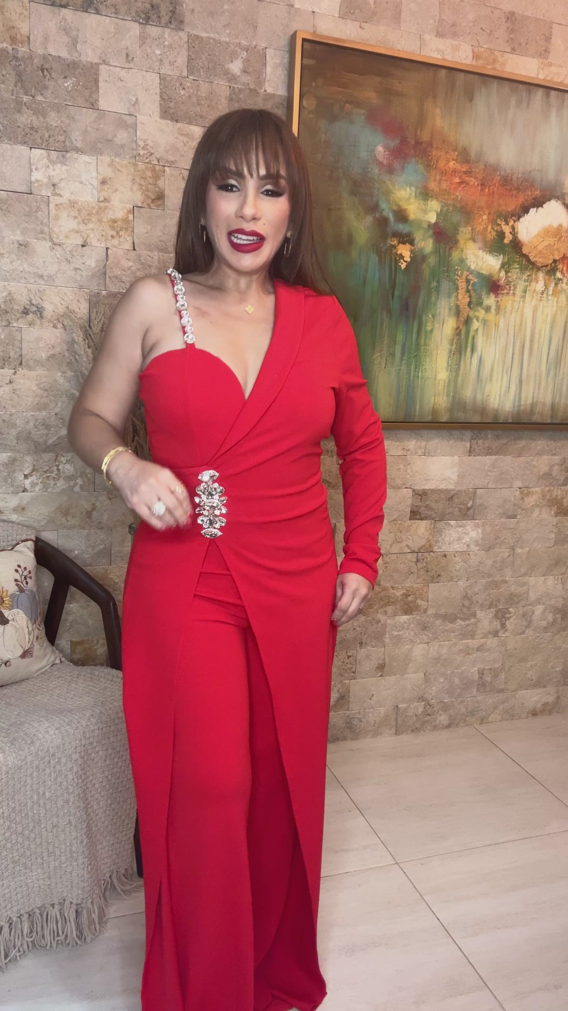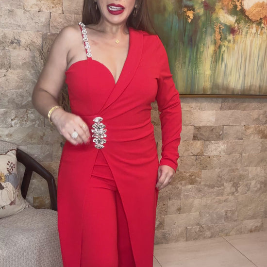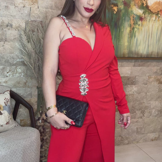 The Xana Jumpsuit features a chic one-shoulder design with a single sleeve on the right side, offering a modern and elegant silhouette. Integrated cups ensure comfort and support, while the delicate rainstone embellishments on the left sleeve and waist add a subtle sparkle that elevates your look. Perfect for making a stylish statement at any event.